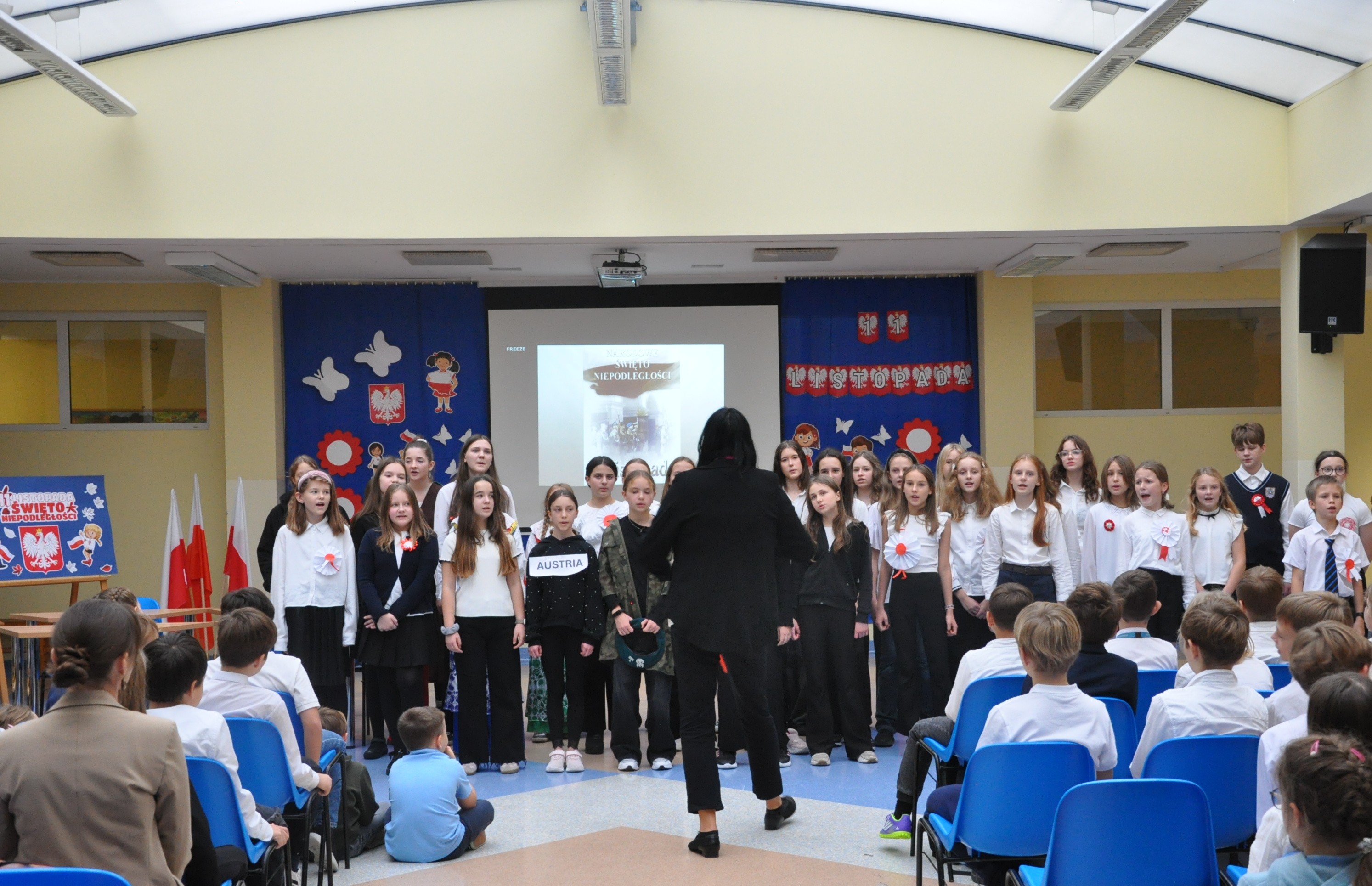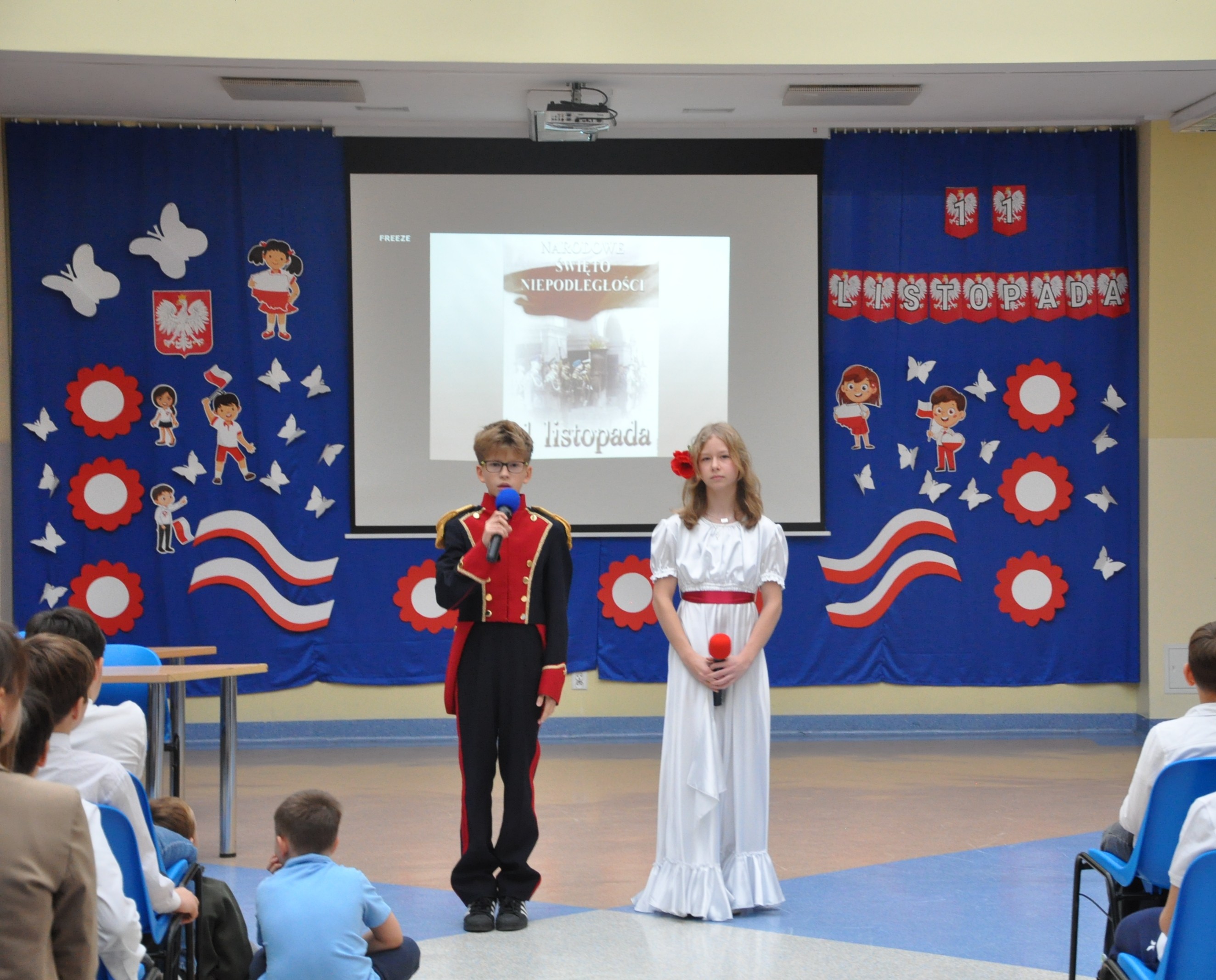 Uroczystość rozpoczęła się od wykonania przez chór szkolny „Bel canto” a cappella dziewiętnastowiecznej pieśni pt. „Ostatni mazur”. Następnie zgromadzeni uczniowie, nauczyciele, dyrekcja oraz goście obejrzeli przygotowany przez klasę 6a i 7a montaż słowno-muzyczny, który przypomniał trudną drogę Polaków do wolności. Nie zabrakło obrazów szlachty zaniepokojonej upadkiem świetności Rzeczpospolitej Obojga Narodów, bohaterskich i pełnych poświęcenia powstańców styczniowych oddających życie za ojczyznę, strajku dzieci polskich we Wrześni czy Legionistów z Wodzem Naczelnym Józefem Piłsudskim. Recytacje przeplatane były nastrojowymi pieśniami patriotycznymi, które wprowadziły wszystkich w podniosły nastrój i pozwoliły głębiej przeżyć tę wyjątkową rocznicę. Klamrą spinającą przedstawienie byli uczniowie prowadzący tę patriotyczną opowieść. Zarówno na początku, jak i na zakończenie uroczystości odtańczyli w strojach z epoki Księstwa Warszawskiego poloneza – narodowy taniec Polaków, będący pięknym wyrazem szacunku dla tradycji i historii. Ten taneczny akcent dodał całości elegancji i wyjątkowego, uroczystego charakteru.