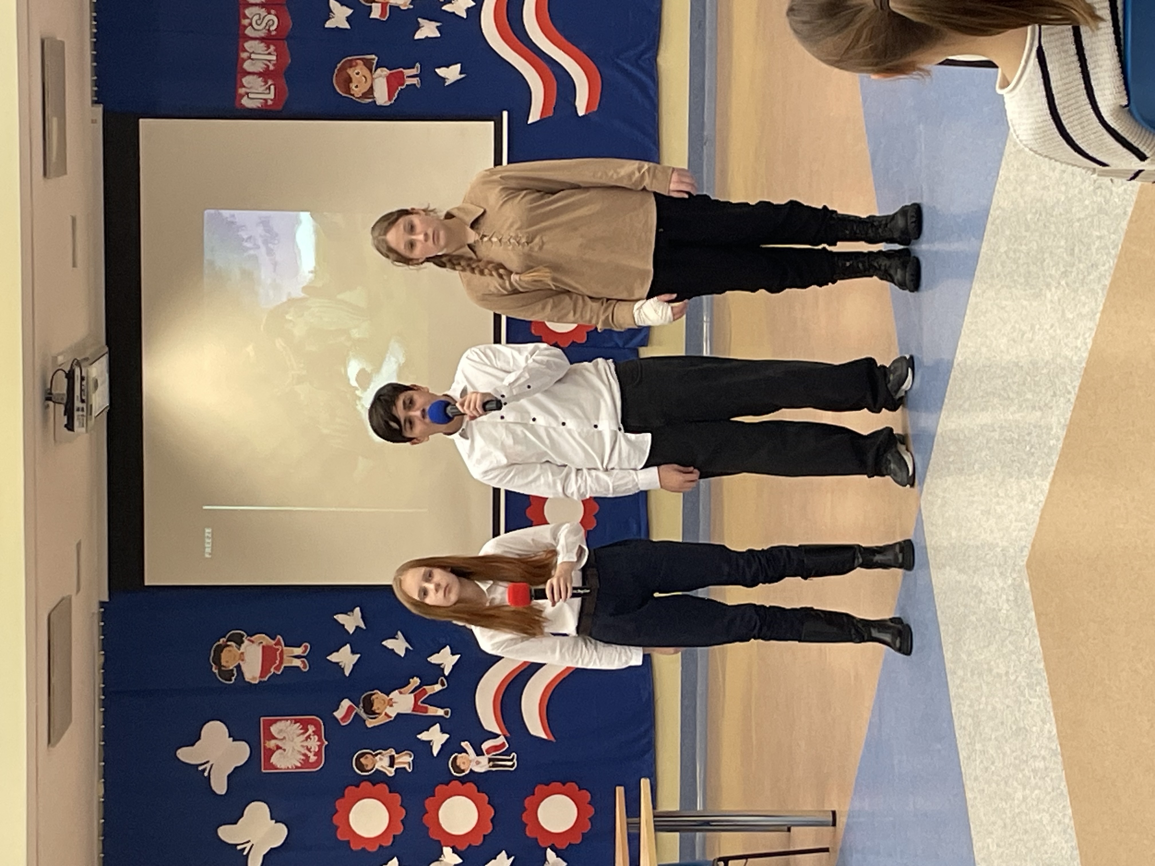 Szczególnym punktem programu był przegląd pieśni patriotycznych, w którym uczniowie – wspólnie z chórem szkolnym – zaprezentowali znane utwory, takie jak „Rota”, „Przybyli ułani pod okienko”, „My, pierwsza brygada”, „Szara piechota”, „Wojenko, wojenko”. Wszyscy wykonawcy śpiewali z ogromnym zaangażowaniem i sercem, oddając hołd bohaterom narodowym i wyrażając wdzięczność za wolną Polskę.