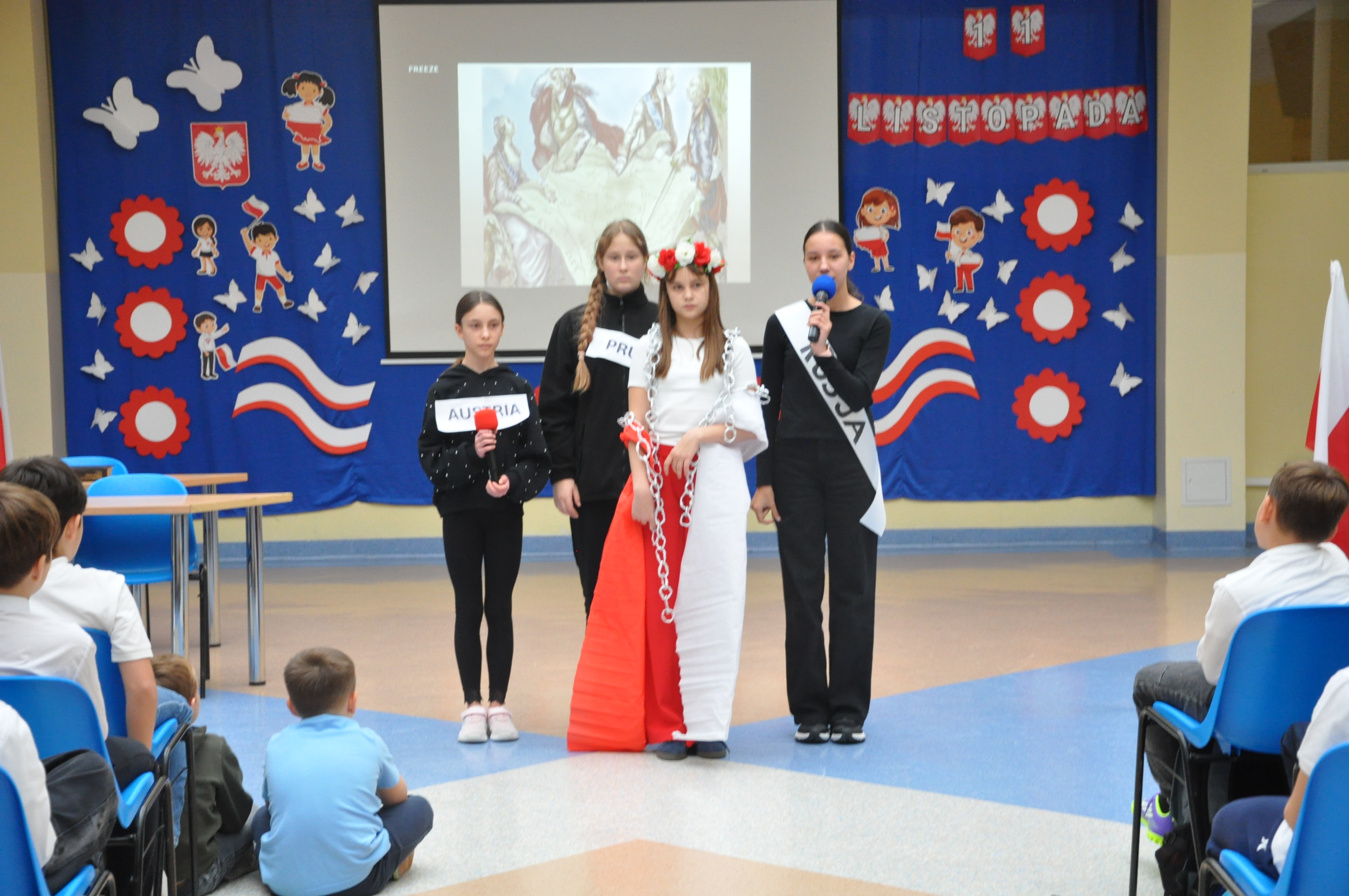 Uroczystość rozpoczęła się od wykonania przez chór szkolny „Bel canto” a cappella dziewiętnastowiecznej pieśni pt. „Ostatni mazur”. Następnie zgromadzeni uczniowie, nauczyciele, dyrekcja oraz goście obejrzeli przygotowany przez klasę 6a i 7a montaż słowno-muzyczny, który przypomniał trudną drogę Polaków do wolności. Nie zabrakło obrazów szlachty zaniepokojonej upadkiem świetności Rzeczpospolitej Obojga Narodów, bohaterskich i pełnych poświęcenia powstańców styczniowych oddających życie za ojczyznę, strajku dzieci polskich we Wrześni czy Legionistów z Wodzem Naczelnym Józefem Piłsudskim. Recytacje przeplatane były nastrojowymi pieśniami patriotycznymi, które wprowadziły wszystkich w podniosły nastrój i pozwoliły głębiej przeżyć tę wyjątkową rocznicę. Klamrą spinającą przedstawienie byli uczniowie prowadzący tę patriotyczną opowieść. Zarówno na początku, jak i na zakończenie uroczystości odtańczyli w strojach z epoki Księstwa Warszawskiego poloneza – narodowy taniec Polaków, będący pięknym wyrazem szacunku dla tradycji i historii. Ten taneczny akcent dodał całości elegancji i wyjątkowego, uroczystego charakteru.